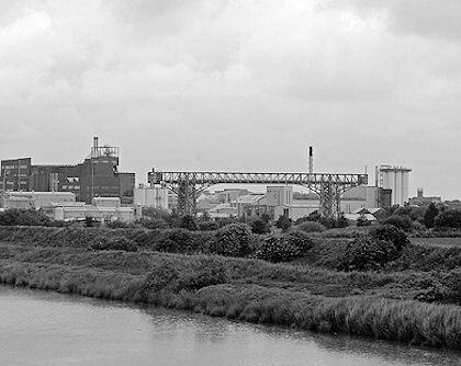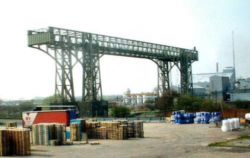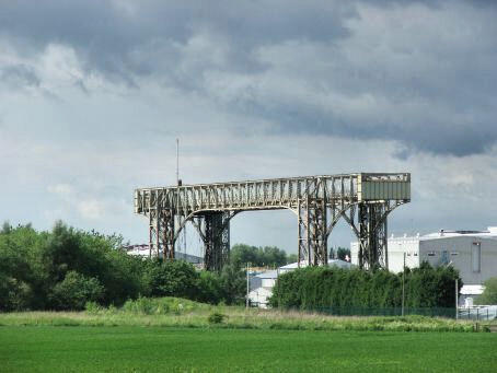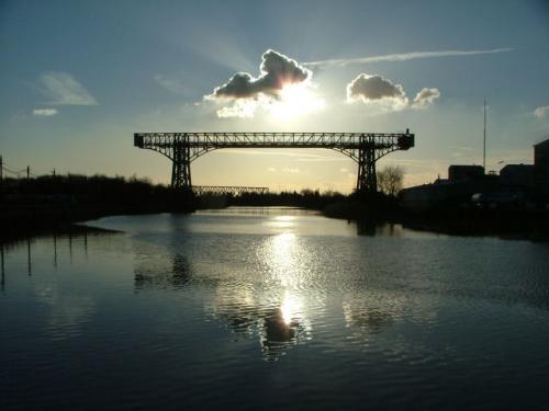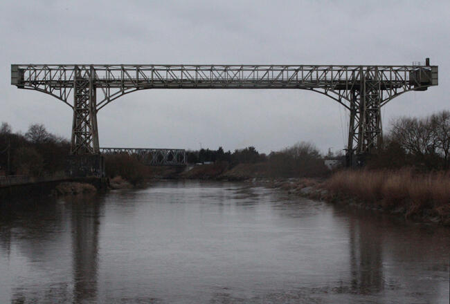 Large structural steel transporter bridge across the River Mersey - the world's only remaining RAIL and road transporter bridge, having been used to carry wagons of cement from the works to the main line.