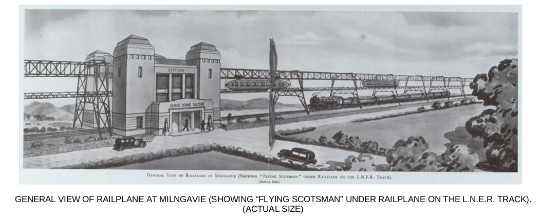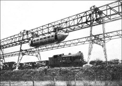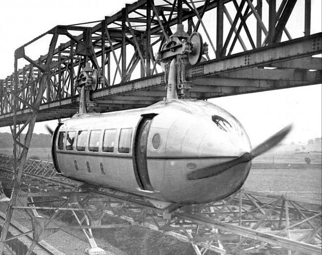 In 1930 inventor George Bennie opened a demonstration track that he had funded above a freight line near Milngavie in which a propellor-driven passenger car shaped like a cigar-case hung from an overhead gantry. At the 1930 launch when it was hailed as futuristic with high levels of enthusiasm. Intended as the precursor to a high-speed network freeing up the railway lines below it for slower traffic, Bennie was never able to get the financial backing to develop the idea further. The proposed Edinburgh to Glasgow line was never built, nor the one between Blackpool and Southport. After a few months it was left to rust, being dismantled in 1956. Bennie himself went bankrupt, but in 1953 called for the Isle of Wight to receive such a system.