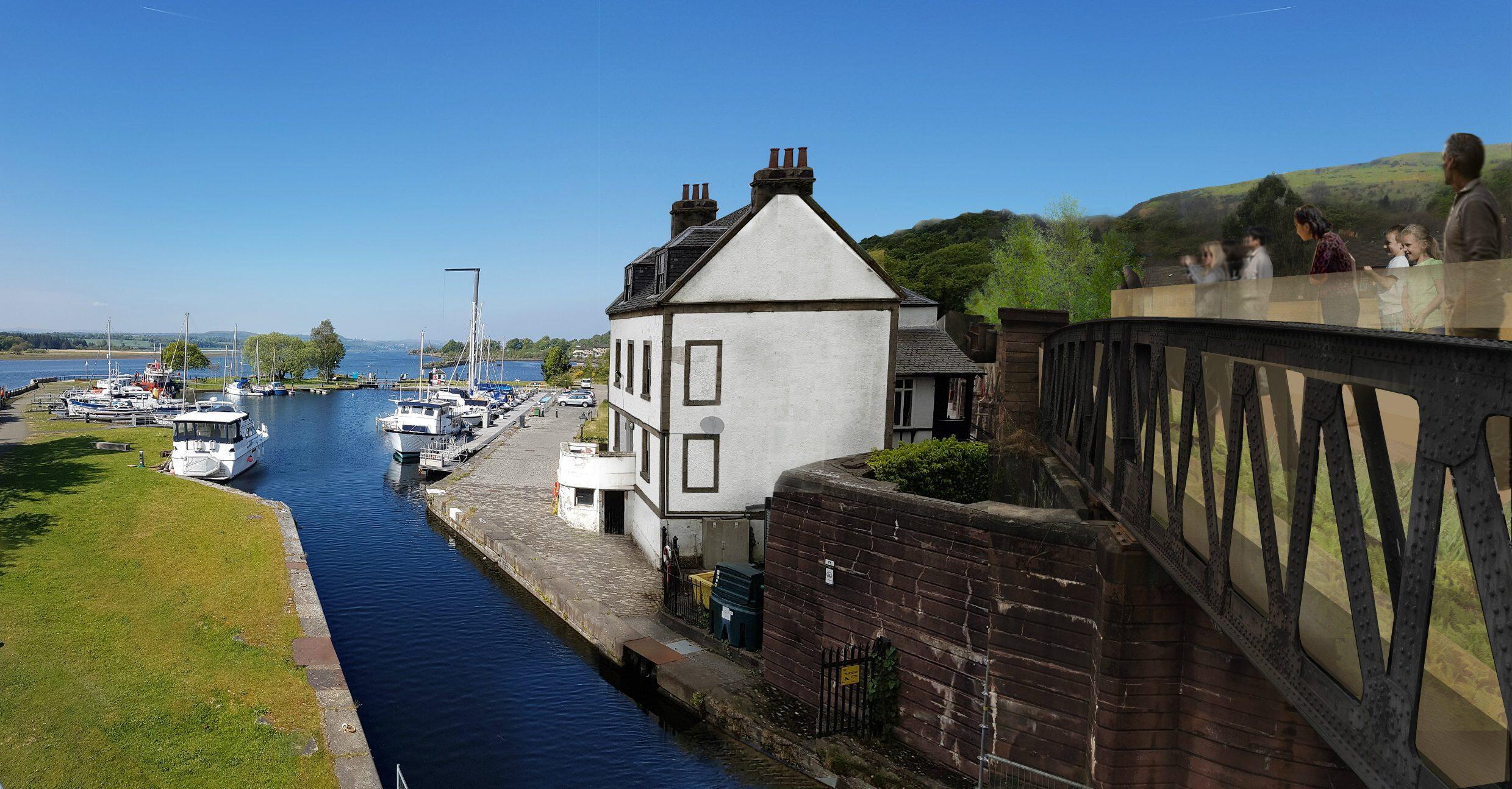 former Swing bridge at Bowling Harbour in West Dunbartonshire that carried the Lanarkshire and Dunbartonshire Railway across the upper and lower basins at the western entrance to the Forth & Clyde Canal and after a half-century of disuse is being developed as an active travel route