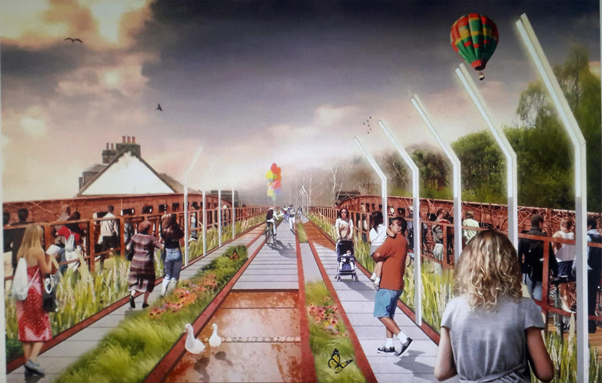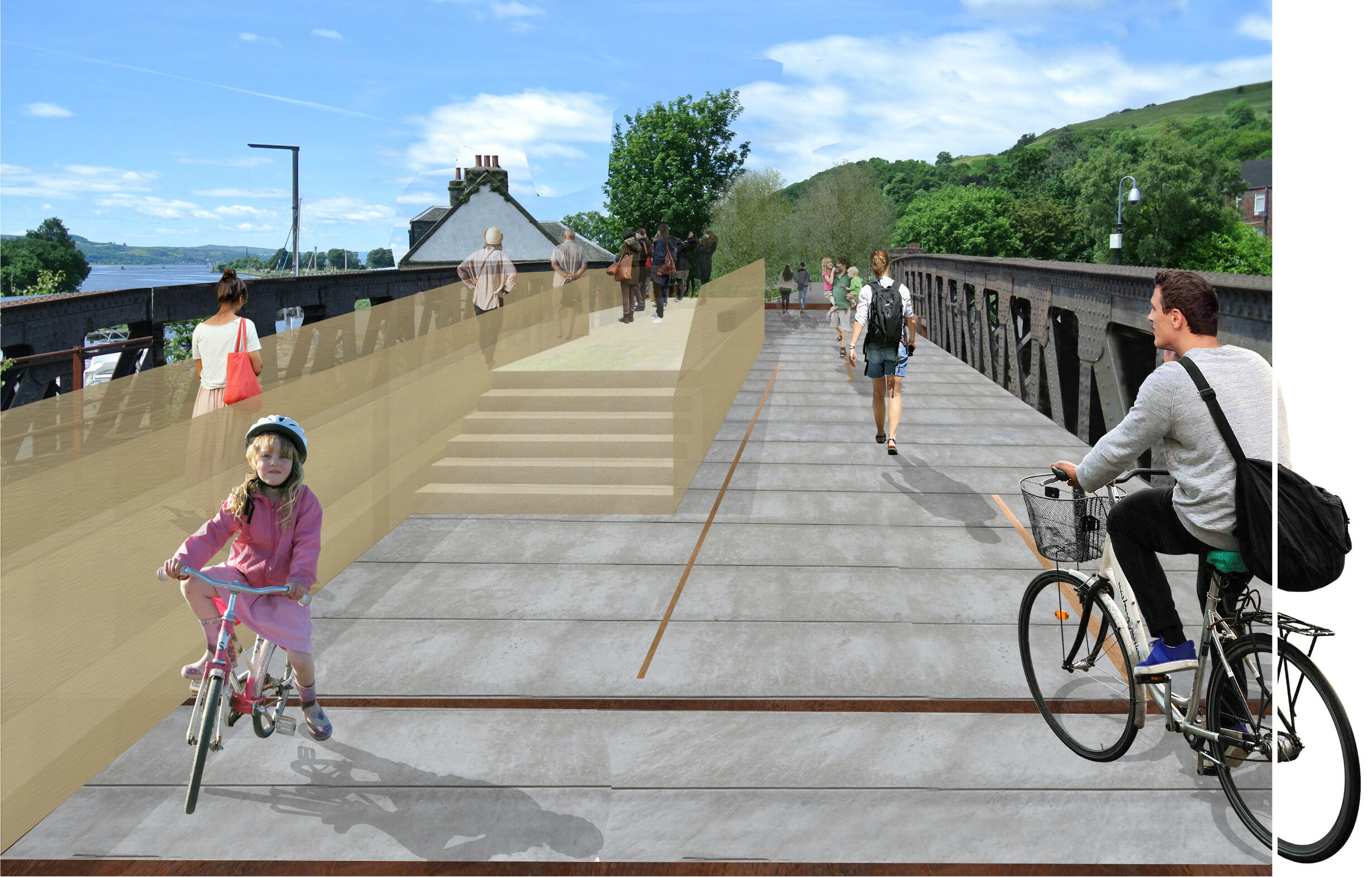 The installation of a new ramp now on site will connect the bridge to the lower level which houses local businesses, improving access for everyone walking, wheeling and cycling. The new ramp will connect active travellers passing through Bowling to the local businesses located in the renovated arches, boosting the local economy and supporting new jobs