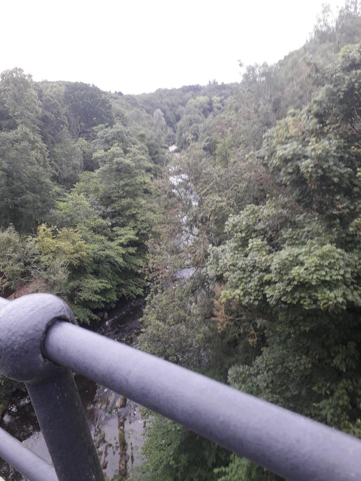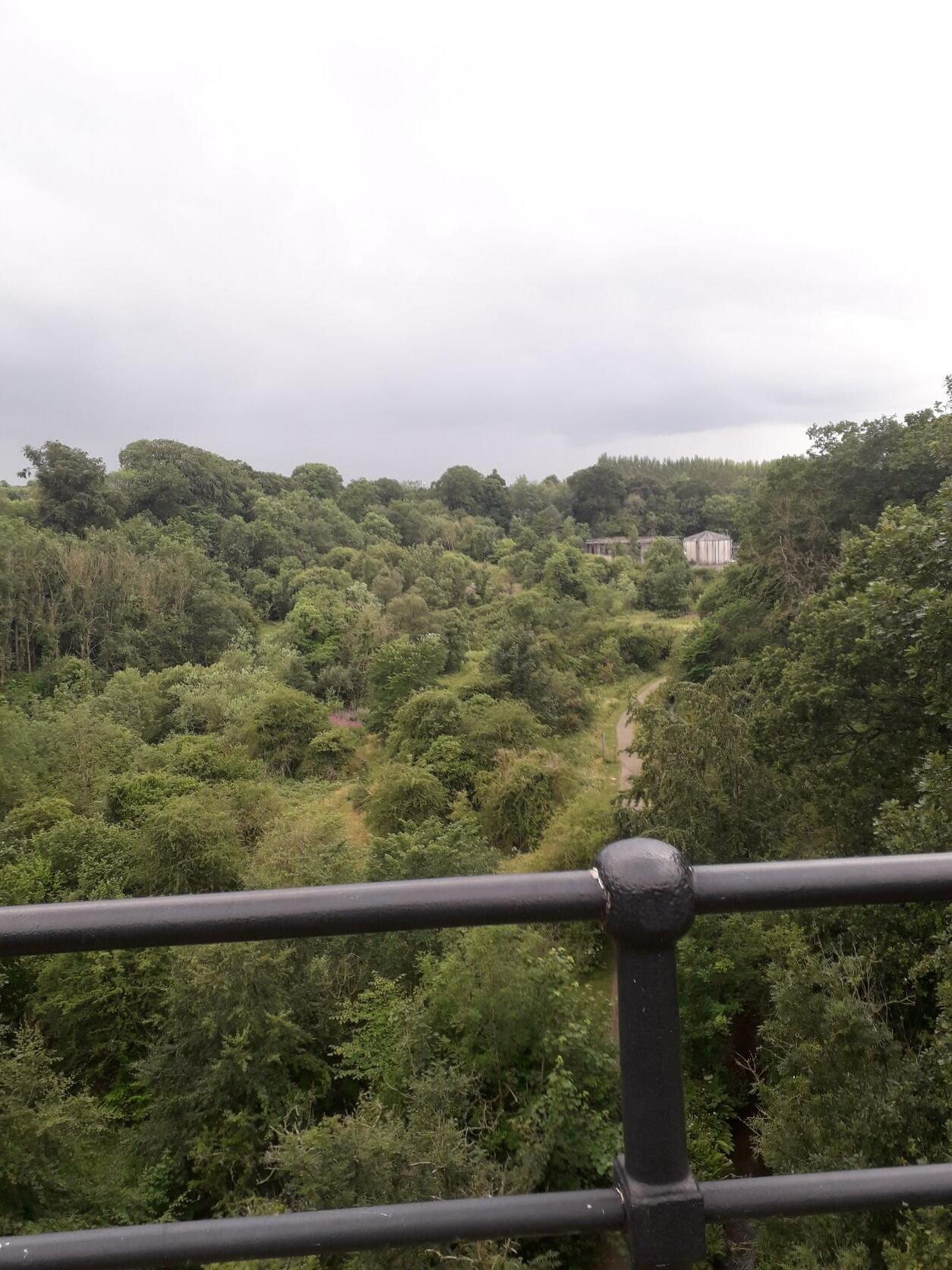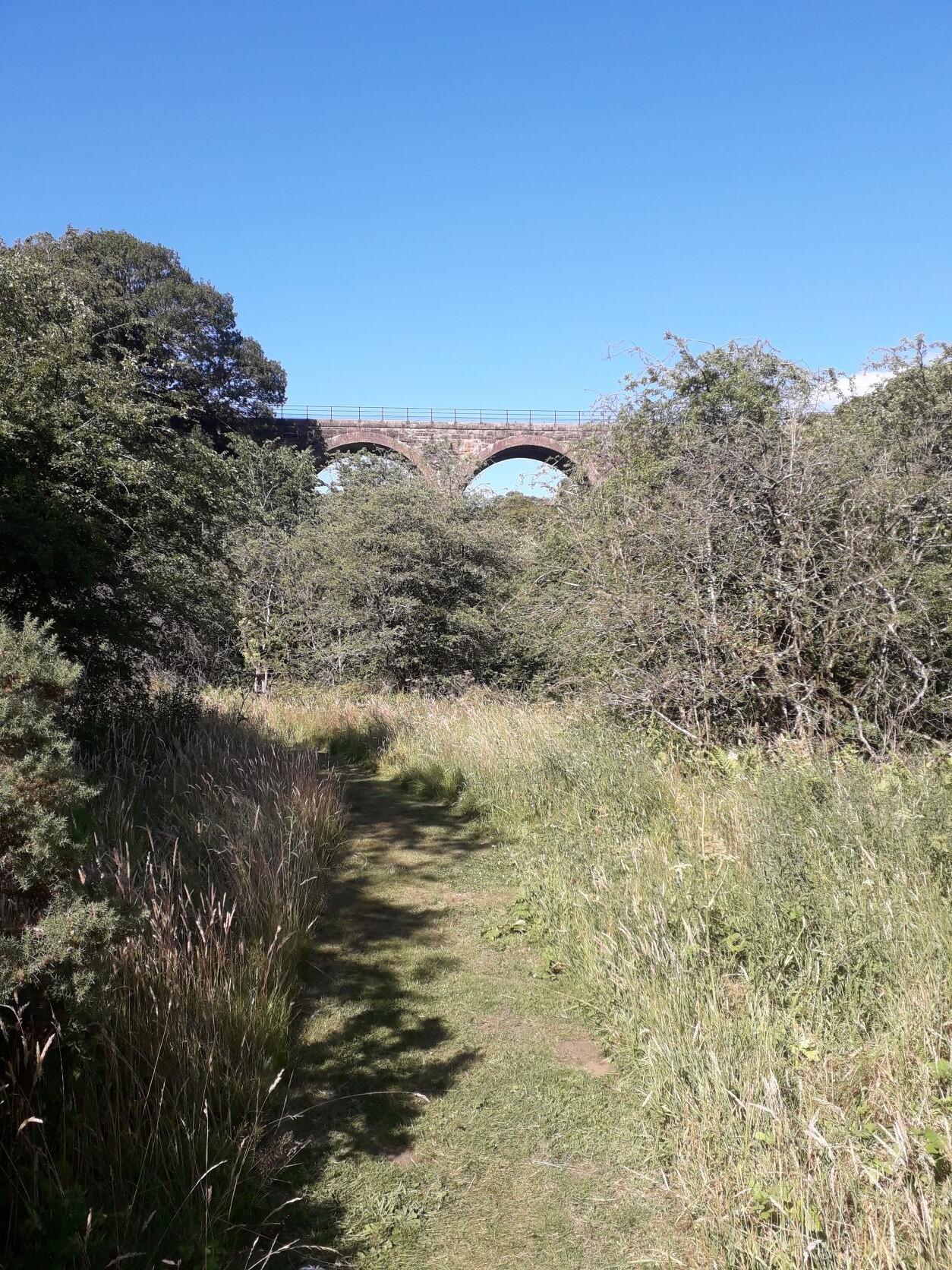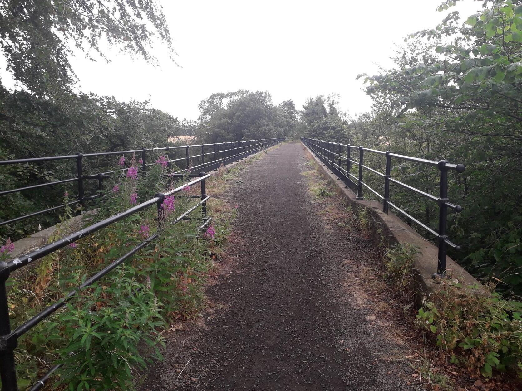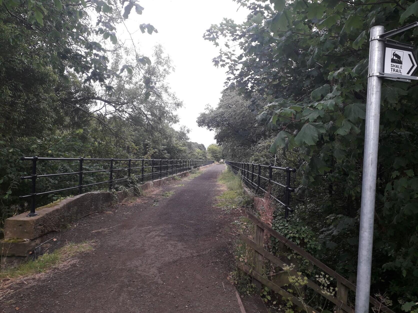 This is a spectacularly gracious structure when seen from below that now takes - see https://shaletrail.co.uk/shale-stories/bridge-between-life-and-death/ - the Shale Trail, the “pathway of Scotland’s Oil Rush” which is a 16 mile walking and cycling route between West Calder and Winchburgh, via the Almond Valley Heritage Centre in Livingston and Broxburn using the Union Canal.