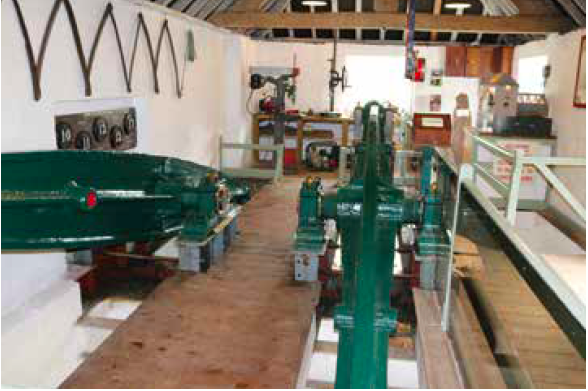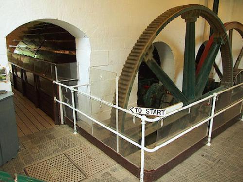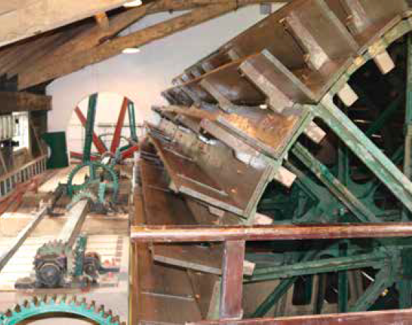 Through a wall and via a large coupling the waterwheel directly drives the "Pit Wheel". This is a cast iron frame with 204 wooden gear teeth. At 4.9m (16 ft) in diameter this wheel runs partly in a pit cut into the floor. Engaged with the Pit Wheel is a Cast Iron gear of 64 teeth, incr easing the rotation to 16 rpm. On the same shaft are mounted the 4.9m (16 ft) flywheel and two cranks. Each crank drives a vertical connecting rod powering the "rocking" beams of the Beam Engines overhead.