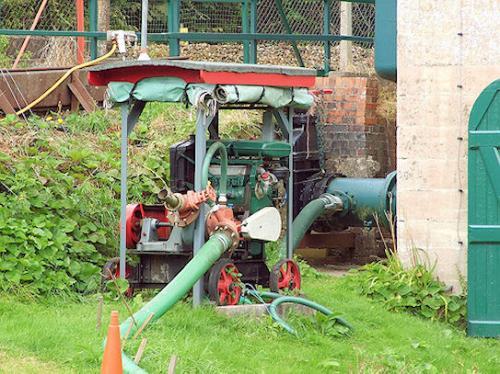 At the driven end of each 5.5m (18 ft) long Cast Iron Beam, is a Watt parallel linkage. These provide a vertical motion to the pump piston rods, which drive down into the 0.5m (1ft 6in) diameter bores of the two lift pumps. The pumps take their water supply from the river outside, via valves with rope seals and wooden seats, each stroke of each pump lifts 227 litres (50 galls) of water to the canal above via the large green pressure vessel mounted outside the building. The whole machine delivers 0.5 million litres (98,500 galls) an hour.