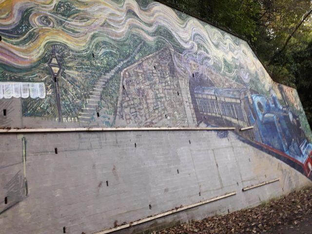Opened 1874 to passenger and freight traffic. Closed to passengers 1943 and to freight 1967. Converted to be part of the Water of Leith Walkway in 1974. Mural begun by Chris Rutterford in 2018 is Scotland's longest. A principal theme is “From a Railway Carriage” by Robert Louis Stevenson, who was brought up nearby.