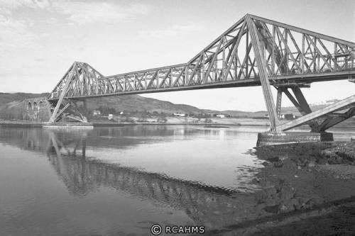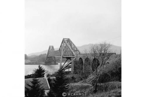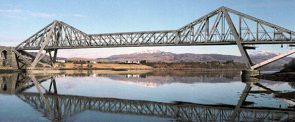 The branch line to Ballachulish left the Caledonian line to Oban at Connel and crossed the entrance to Loch Etive at a height sufficient to allow shipping to pass. The strong currents prevented the use of piers so a long cantilever span was built, at 524 ft, the longest in Britain after the Forth Bridge. From the outset it was for a single track railway and a narrow roadway.