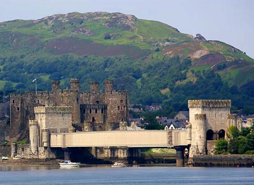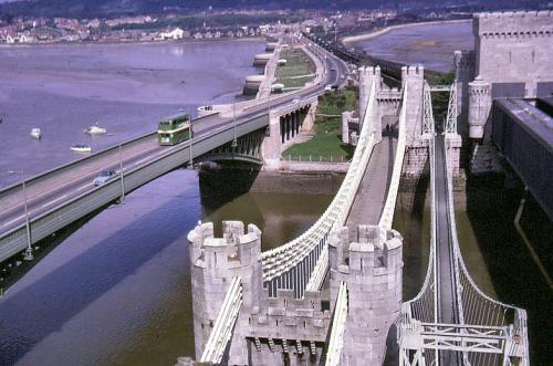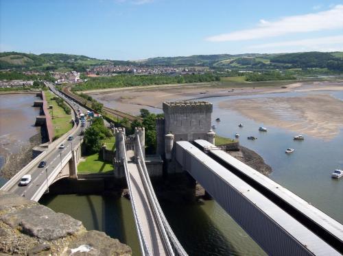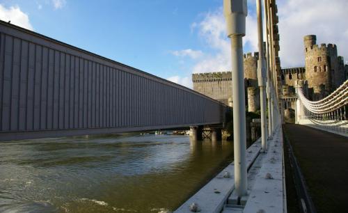 The Conwy railway bridge runs parallel to an elegant suspension bridge built by Thomas Telford (see entry), which is now in the care of the National Trust, and is open to pedestrians only. These crossings of the Conwy resemble in miniature the two greater crossings of the Menai Strait.