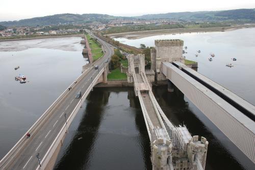The bridge runs alongside the wrought iron tubular railway bridge built by Robert Stephenson (see entry). Until Stephenson's bridge was built, Telford's bridge was the only crossing of the river. It is now only passable on foot.