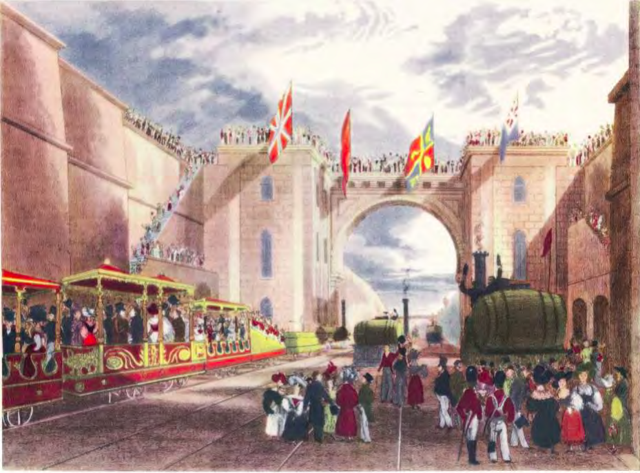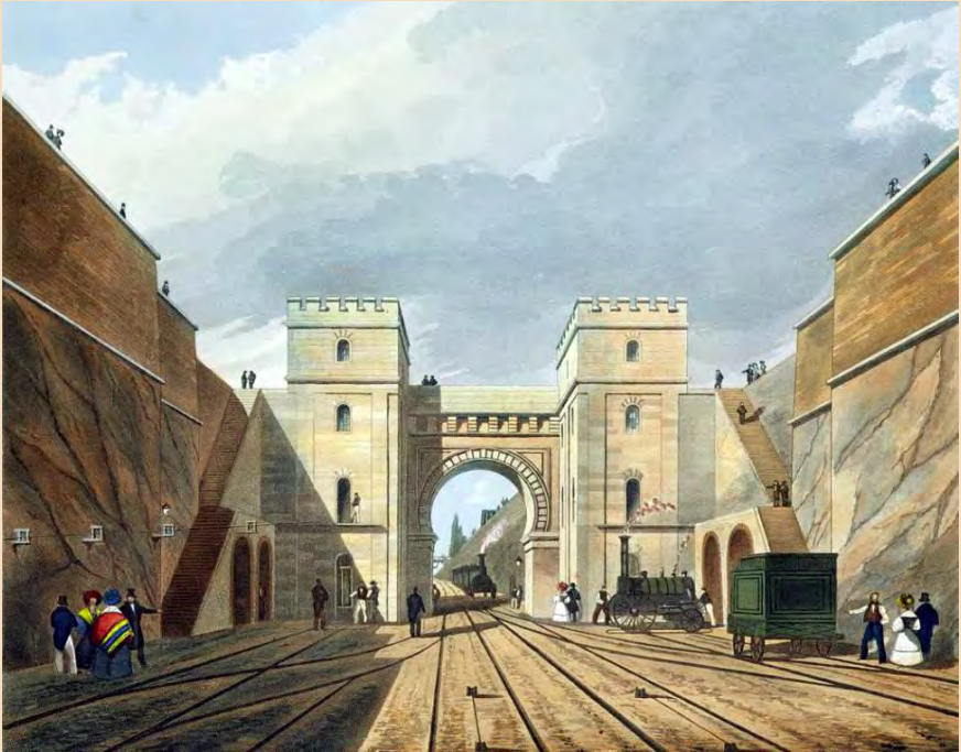 The first station was located in a deep sandstone cutting, with three tunnels at the west end. The largest bore, in the centre, was the Wapping Tunnel, a long incline leading to Wapping Dock. The goods wagons descended by gravity, but were hauled up by a winding engine. When first opened, it was whitewashed, lit by gas, and used as a promenade by visitors.
