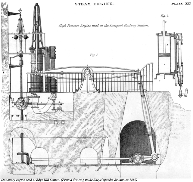 The tunnel to the north of the central bore was much shorter and inclined upwards, leading to the passenger terminal at Crown Street. From here the trains descended by gravity to Edge Hill station and were wound up into Crown Street.