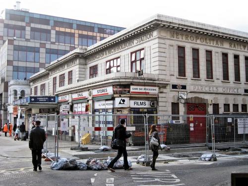 The station building is an unusually well-preserved piece of early 20th-century London Underground architecture. The original signage is extant, showing "Farringdon & High Holborn" on the fa§ade, as well as other indications of the Metropolitan Railway's original main-line style operation. A sign for a "Parcel Office" survives on the exterior wall. The building is Listed Grade II.