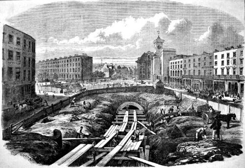 The route from Paddington to King's Cross was largely built by cut-and-cover; eastwards, the route was constructed in a 665 m (728 yds) tunnel under Mount Pleasant, Clerkenwell then followed the culverted River Fleet beside Farringdon Road in an open cutting to the new meat market at Smithfield. Brick retaining walls were constructed In the 10.2m (33ft 6 ins) trench for the running tunnels to support an elliptical brick arch or iron girders with a 8.7 m (28 ft 6 ins) span; to accommodate platforms, the bore was wider at stations. Two three-rail mixed gauge tracks were laid to accommodate both the standard gauge trains of the GNR and the broad gauge trains of the GWR. When completed at the end of 1862, the total cost had risen to £1.3 million.