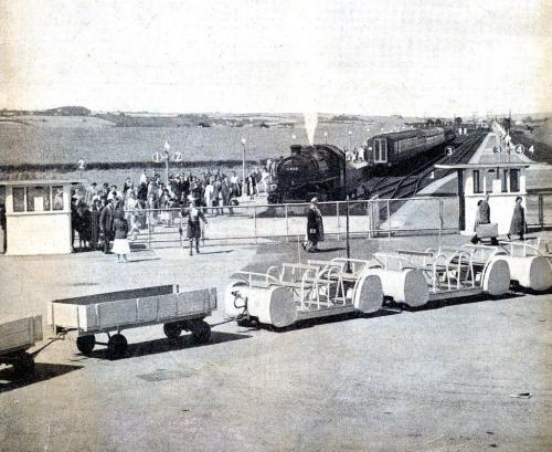 The station was on a short branch line with two 275 m (900 ft) long platforms permitting four trains could be handled at the same time. Campers were transferred from the station via a 'road-train' that ran under the road via a dedicated cast concrete subway. During the heyday of holiday camp rail traffic, trains arrived and departed to towns throughout the country. A Glasgow service was introduced in 1957 and served both the camp station and Scarborough Central, the working being known as the 'Gorbals Express' by station staff . The King's Cross train from the capital had an afternoon arrival time of 13.43 and was the only one to provide restaurant and buffet car facilities.