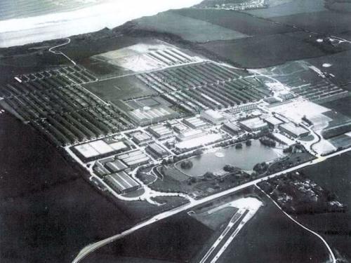 Billy Butlin's inspiration for his holiday camp empire came from an unhappy holiday on Barry Island in his youth, when he had been locked out of his bed and breakfast accommodation all day by his landlady, which was normal practice at the time. Hisfirst Butlins Holiday Camp was opened in 1936 in Skegness;a second camp at Clactonfollowed in1938 and construction of a third began at Filey (1939). With the outbreak of World War II, Filey was completed by Butlin as a military camp for the RAF Regiment (RAF Hunmanby Moor), housing 6,000 military personnel. InMay1945, with the assistance of 400 RAF personnel, the camp was able to partially open to the public, althoughone half of the camp remained in military use until 1946. The neat, ordered, rows of basic accomodation blocks and mess buildings readily betrayed the sites military heritage.