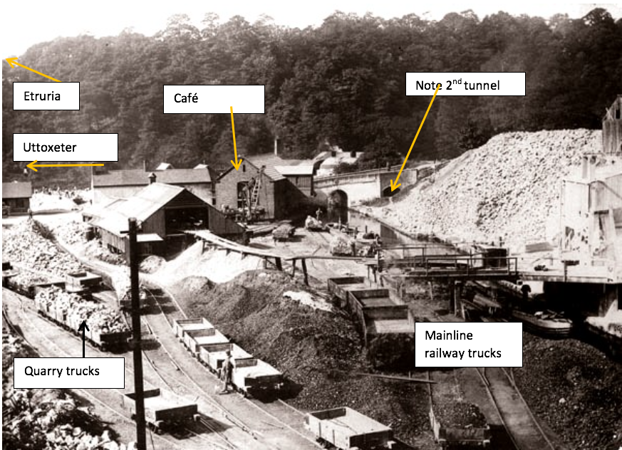 The historical photos were extracted from Issue 19 of Archive Magazine, published in September 1998. Issues 19, 20 and 21 of Archive magazine contain a three part article entitled the Limestone Quarries of Caldon Low. The author of the article is Basil Jeuda. Where “author’s collection “ appears as a credit on the photographs it refers to him. Basil followed up the Archive articles with a book ” The Quarries of Cauldon Lowe” published by Churnet Valley Publications in 2000.