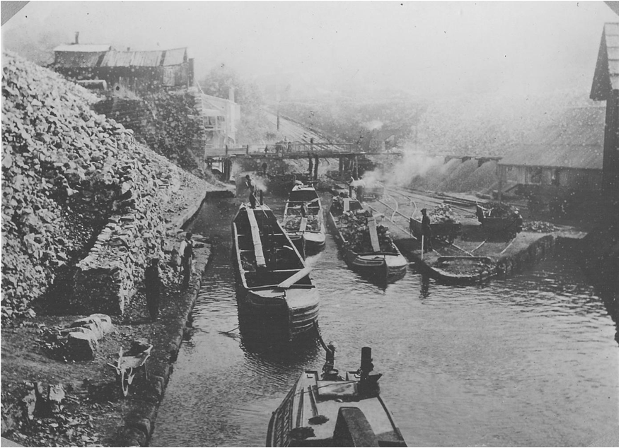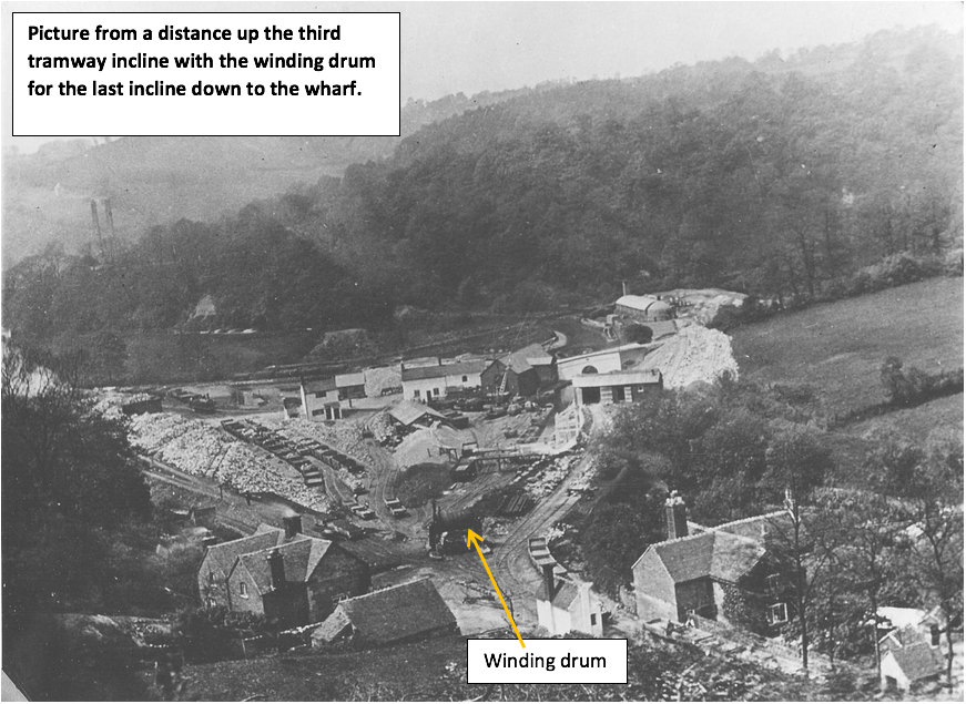 By 1847 the demand for limestone was such that a tramway with four times the carrying capacity of the 1803 tramway was planned, and opened in 1849. (This did not require parliamentary approval because all landowners agreed to sell the land to the NSR) The fourth tram road was designed by local engineer, James Trubshaw, was the most heavily engineered of them all, consisting of a series of self-acting inclines leading all the way from Froghall Wharf to the quarries. The horse-drawn flat sections of Rennie's plate way were dispensed with. Where necessary, substantial embankments and cuttings were constructed to keep the incline more-or-less constant and the final section, leading to the quarries, included a tunnel. The technology used this time was that of a modern-style railway but using a three-rail system, in which the centre rail was shared by the up and down lines. Trains of climbing and descending wagons were linked by a continuous cable which ran on a series of rollers and guides along the centre of the tracks. At the top of each incline the cable passed through a braking system, which controlled the speed of the trains. In the middle of each incline, the centre rail divided into a conventional double track layout, so that the trains could pass. This tramway had the capacity to carry 1,000 tons of limestone to the wharf daily, in wagons carrying only 6 tons each. The stone then being loaded by hand, into canal barges with a capacity of approx. 25 tons each, for onward transportation. The majority of the limestone was supplied to Brunner-Mond (later to become ICI). In 1920 they acquired Tunstead quarry at Buxton which in March 1920 caused the tramway and wharf to become redundant. The North Staffs Railway’s Caldon Low rail system closed in 1920 and limestone to be carried by canal was, instead, loaded from standard-gauge wagons at a new basin near Endon. Deliveries to the limekilns at Froghall continued by road into the late 1930s.
