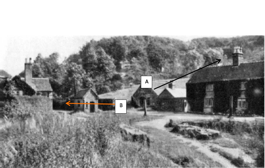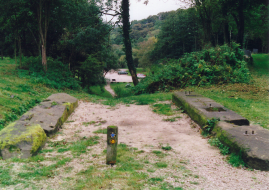 View at top of first incline, after wharf had been closed, stone bases of winding drum. The third tramway came down the incline (black arrow) to the building marked ‘A’The fourth and final tramway (now more strictly a railway) went to the quarries in the direction of arrow ‘B’