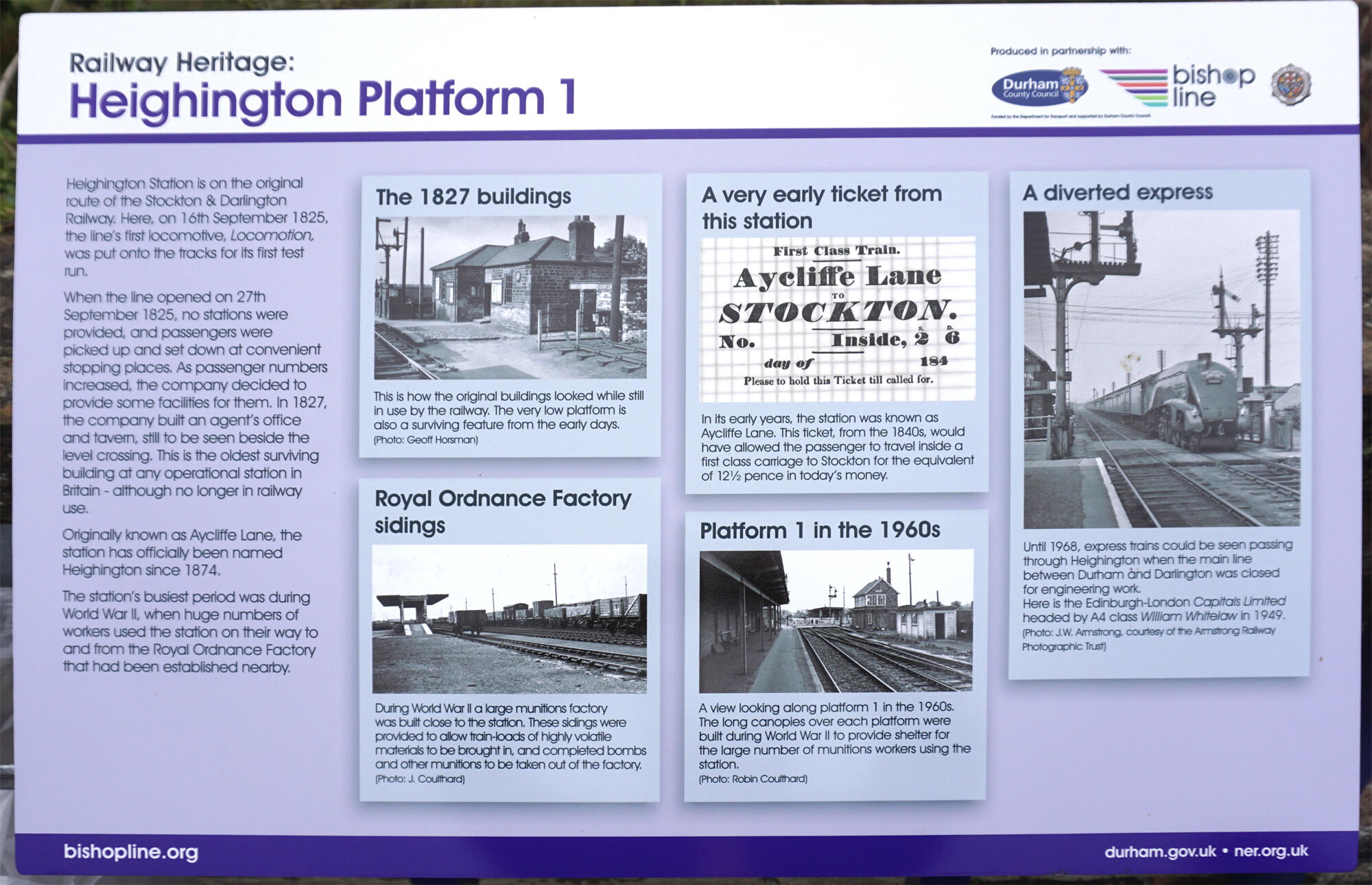 Heighington station is a historic railway spot where the Stockton & Darlington Railway crossed Aycliffe Lane. It was at this spot on September 16, 1825, that Locomotion No 1 arrived on three horsedrawn wagons from Robert Stephenson’s works in Newcastle where it had been made.