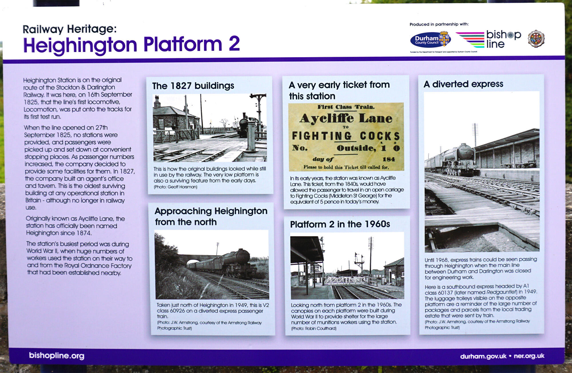 The Locomotion public house at Heighington station (which is actually in Newton Aycliffe) was one of the first lineside buildings, built in 1826 by John Carter – the platform, which still abuts the line, is said to be the oldest railway platform in the world!
