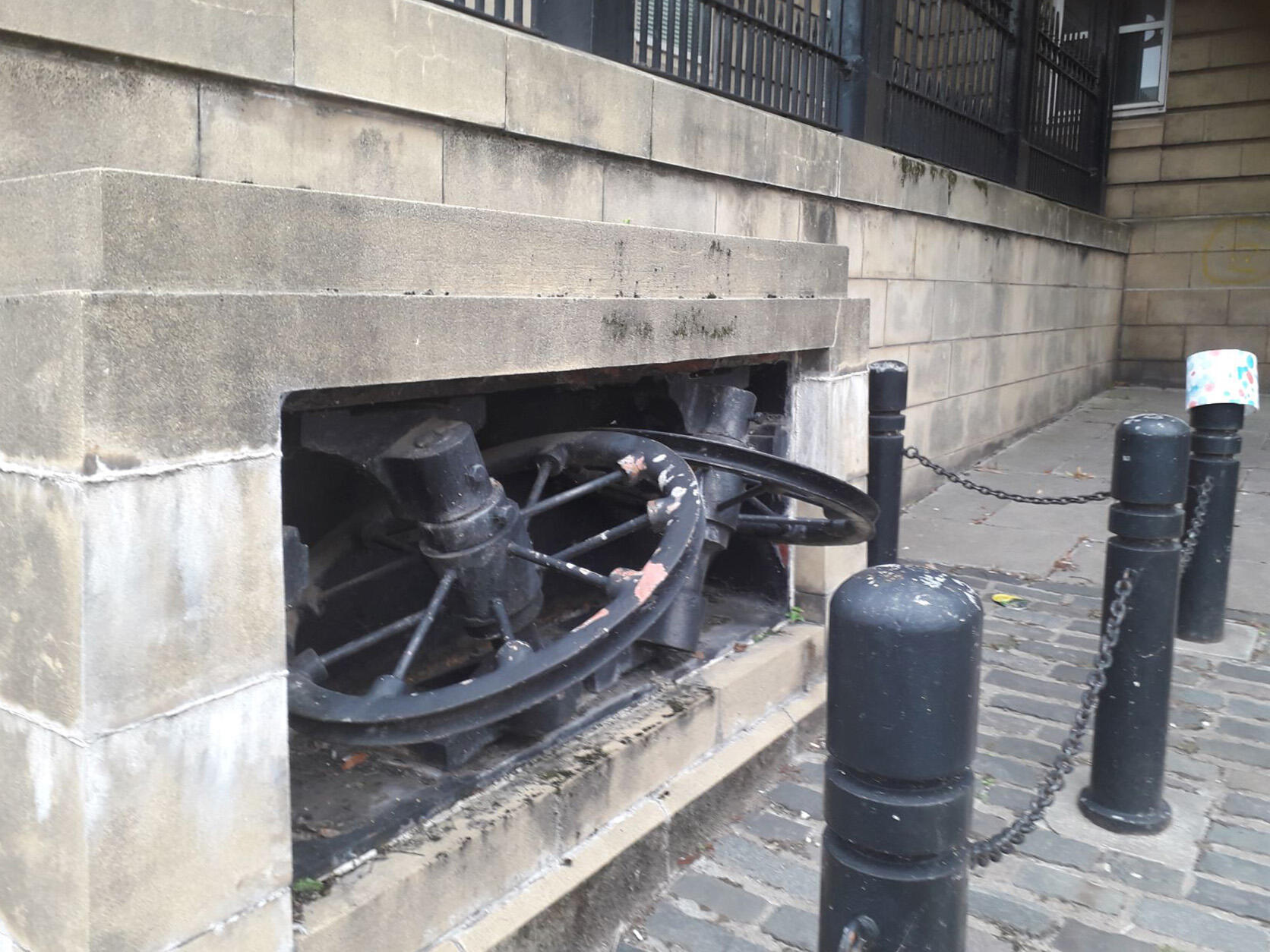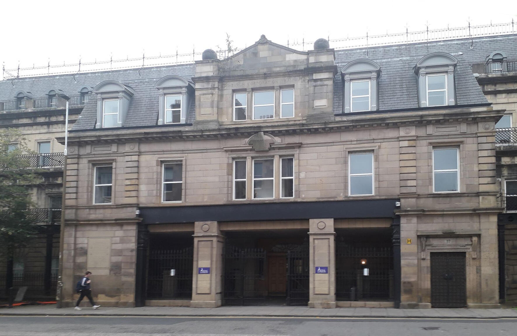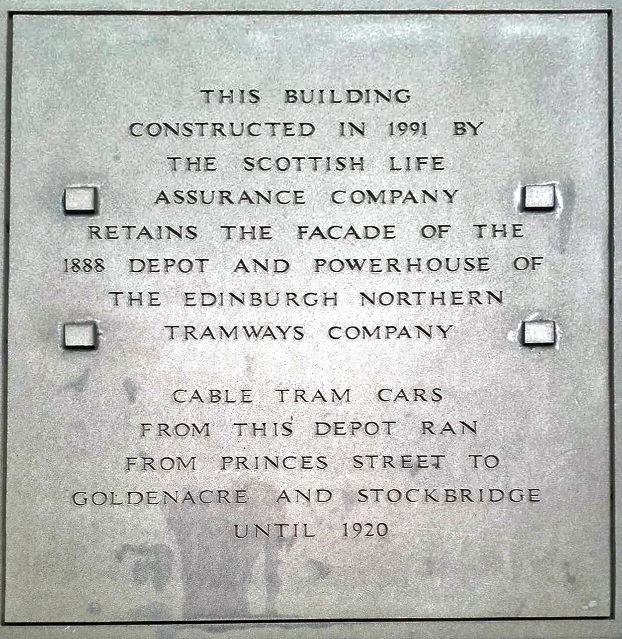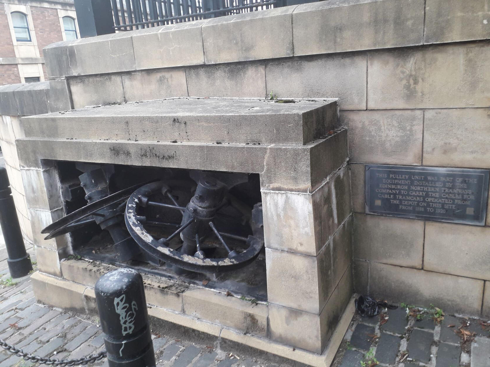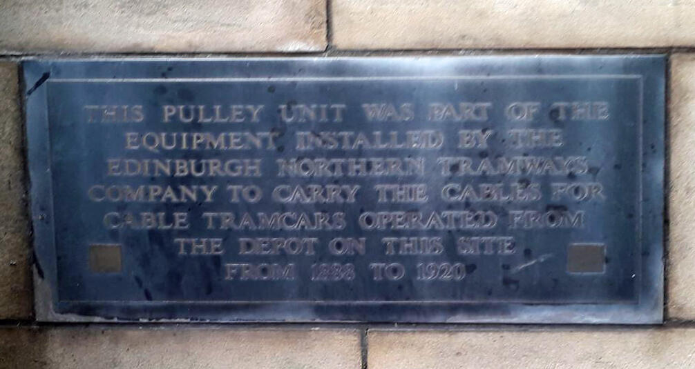 In 1888 the Edinburgh Northern Tram Company built a power station and depot for its cable-trams at Henderson Row, on the northern fringe of the city’s Georgian New Town. With conversion from cable to electric operation, on 24 January 1921 the power station closed as those at Shrubhill and Tollcross were sufficient to power the new network, and the site was sub-sequently used as a bus depot and as Edinburgh’s police garage. In 1991 the Scottish Life Assurance Company (now part of the Royal London Mutual Insurance Society) redeveloped the site, retaining the façade on which a plaque tells the building’s story. Preserved on public display round the back on the east side is a pulley unit used to carry the cables.