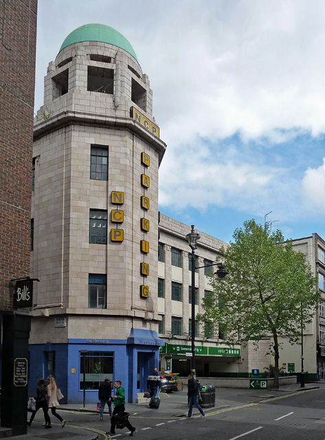 This impressive building with domed tower all in white stonework is a good example of the art deco style as applied to the multi storey car park. Located close to London's theatre land it was convenient, and space limitations suggested the solution of parking cars on four levels. Separate rooms were provided for chauffeurs and changeing rooms for ladies.