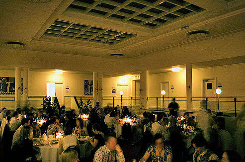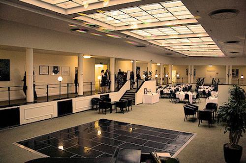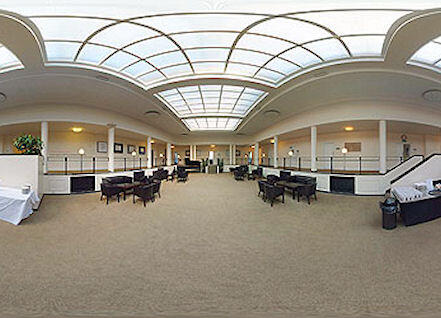 To either side of the double doors leading from the entrance hall through into the heart of the building are two striking painted mural panels by Norman Wilkinson. On the left is of an LMSR ferry leaving port, the one on the right of three generations of locomotives spanning a century of steam, embodied by the LMS in 1938 -The Rocket, a late-19th-century coal engine, and a then-new streamlined Princess Coronation Pacific, in full blue and white livery. The doorway leads to what was originally called The Hall of Transport, now known as The Sunken Lounge', the sunken centre surrounded by colonnades. The room was originally built to house a very large electric gauge 'O' model railway which ran within the colonnade and on which students could learn the rudiments of signalling and train operation. It was a key space in the building. The railway was removed in the 1960's.
