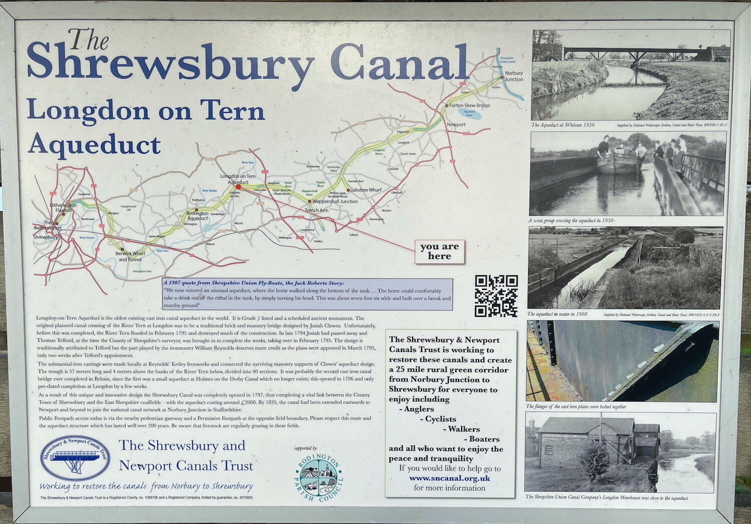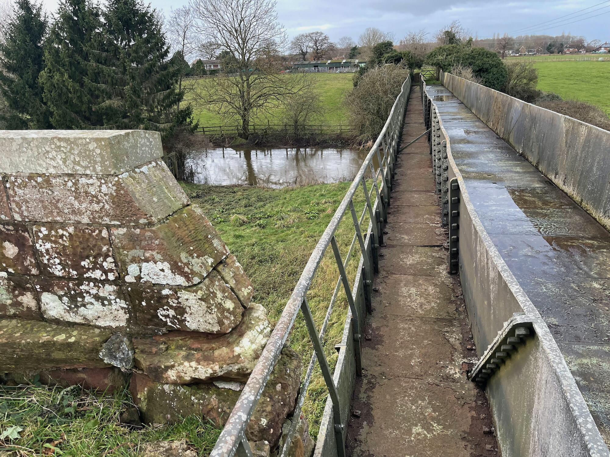 The first canal aqueduct to be constructed in cast iron, it was built by Thomas Telford to carry the Shrewsbury Canal across the river Tern. It is listed Grade I and is a scheduled Ancient Monument.