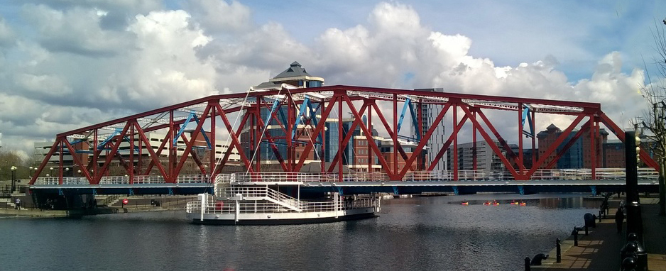When the Manchester and Salford docklands were closed in the 1970s, it was decided to retain the bridge as a feature of the redevelopment of The Quays. In 1988 a sailing licence was acquired to float the bridge down the Ship Canal on pontoons to a new position across the former No. 9 Dock where it is currently used as a footbridge.