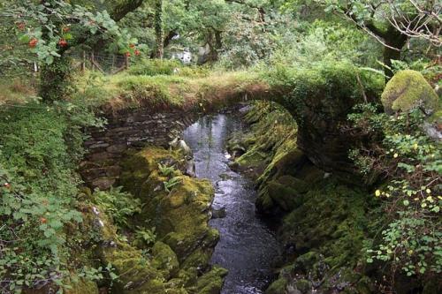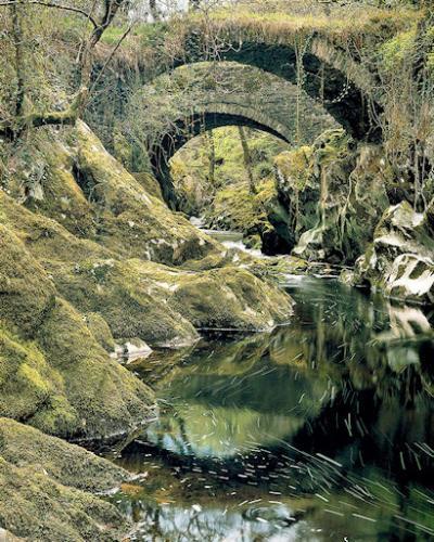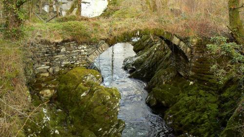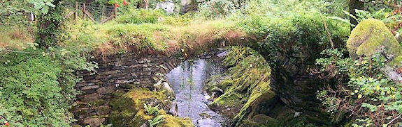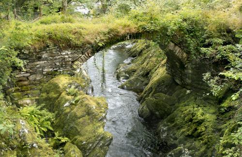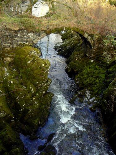The old Roman bridge which spans the Afon Machno close to the now disused Penmachno Woollen Mill.