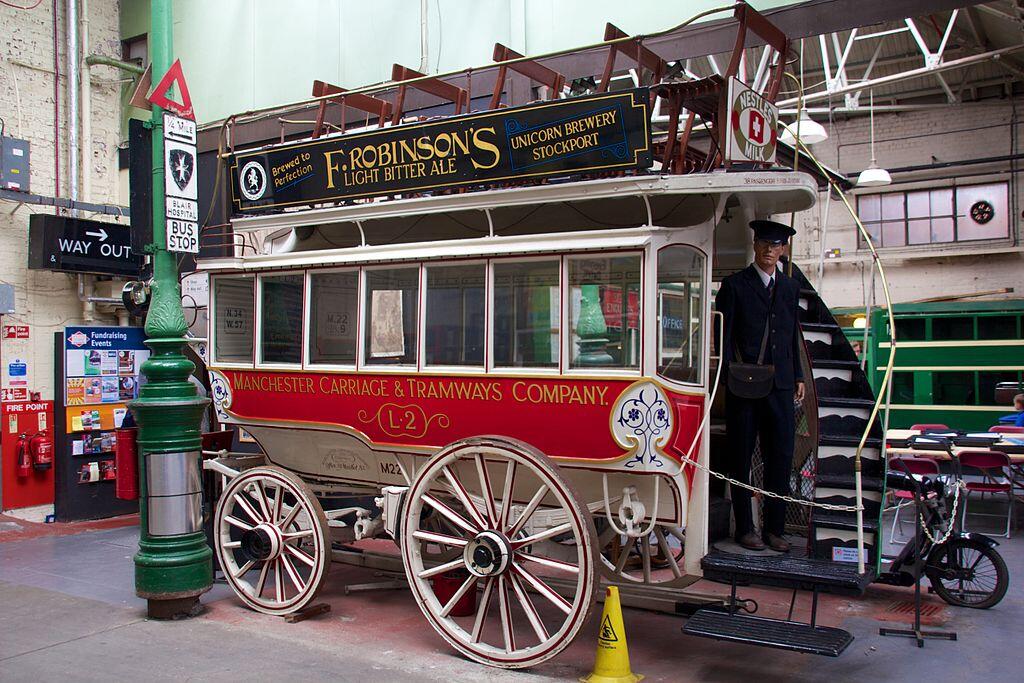 In the late nineteenth century, despite the rapidly expanding Victorian City, the area where the Museum of Transport and First’s Manchester bus garage now stand was still open. In June 1899 the Cars, Sheds and Staff Sub-Committee of the Manchester Corporation Tramways Committee investigated the area and found it suitable as the site for an electric tramcar shed. At the time they were planning to take over and electrify the horse tram lines of the Manchester Carriage and Tramways Company – who built and operated the horse bus which can be seen in the Museum. The site was duly purchased from Lord Derby and in June 1900, Councillor Daniel Boyle, Chairman of the Transport Committee, laid the foundation stone of the Queens Road Tram Depot.