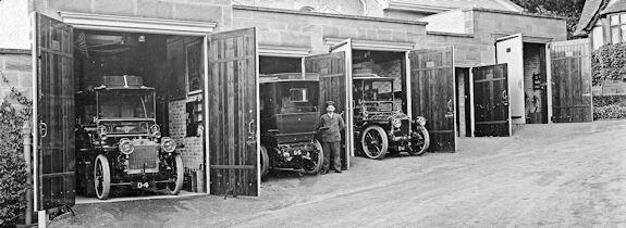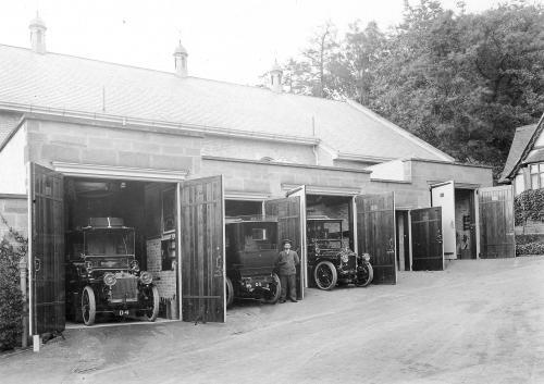 The five garages were described in great detail in the Badminton Library chapter - "long narrow rooms", varying in size. One, equipped as a repair workshop will accommodate two moderate-sized vehicles, or can be used as a washing house in bad weather. Another could store three small cars, another two large ones, while a smaller "stable" would hold two small or one very large car. The final garage could be used as a cycle house, or to store a small car.