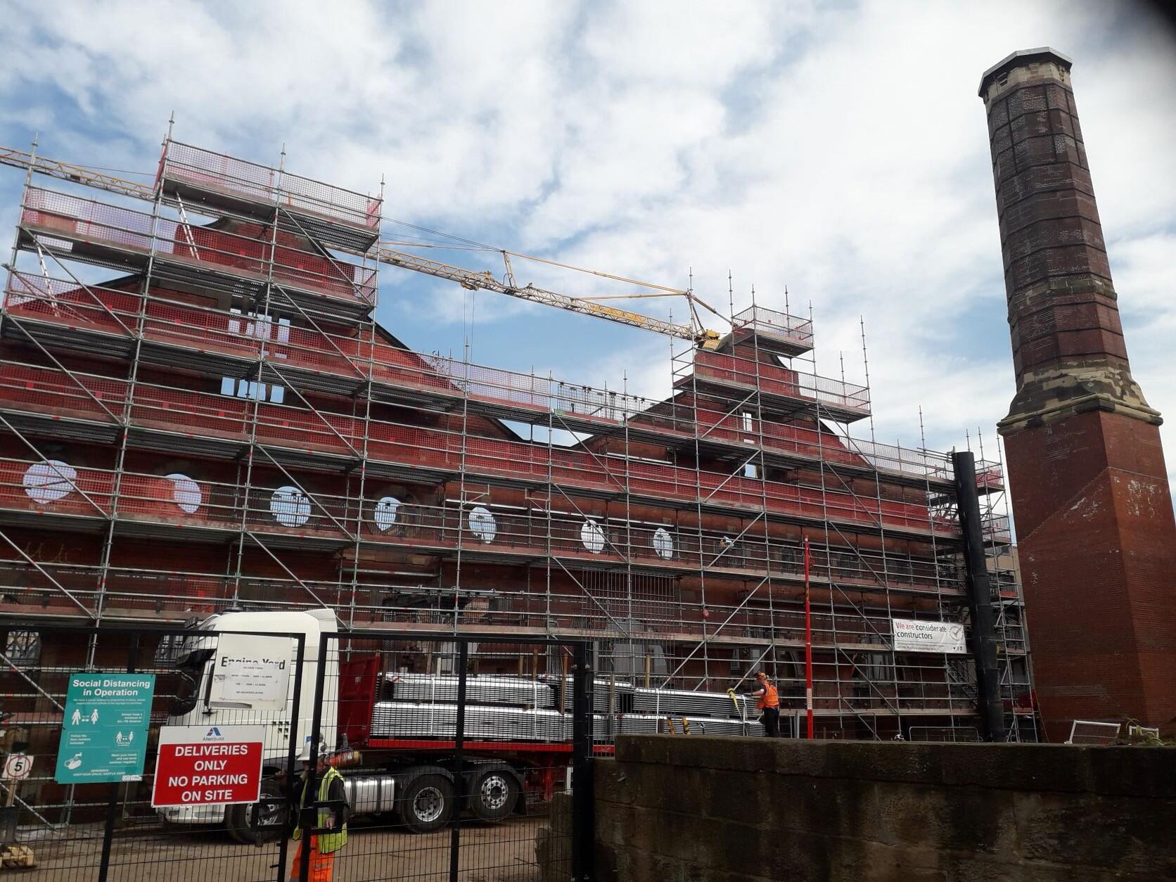 Edinburgh trams converted from cable to overhead wire in 1926, bringing them into line with nearby Leith, and the last tram ran thirty years later (until their return in 2014). The works became a bus depot for the Corporation, and later with its successor, Lothian Region Transport. After closure as a bus depot, it briefly became a museum and - like any other good abandoned building in Edinburgh - a Festival Fringe venue. By 2011, the once splendid buildings had fallen into disrepair and it was added to Historic Environment Scotland's Buildings at Risk Register. Now however it is being incorporated in the adjoining Engine Yard development, which Cooper Cromar architects say will preserve as much of it as possible: "By integrating many and varied historical elements into the new development, including an existing ‘B’ listed chimney, boundary walls and tram depot, we were able to create a true sense of place and maintain the site’s ornate industrial character."