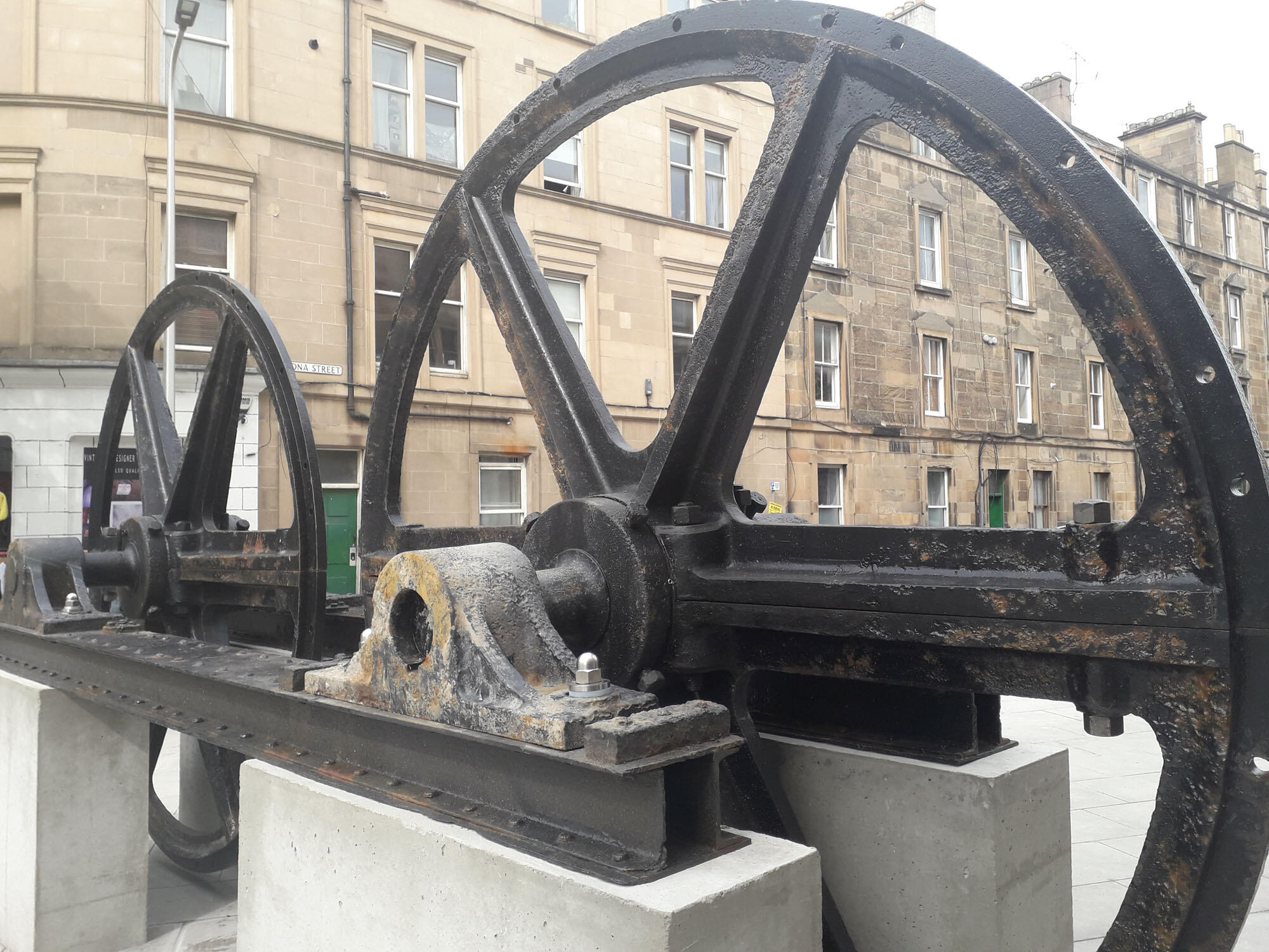 Two of the huge wheels that carried the cables are displayed in Iona Street as public art. They were discovered buried during recent excavations to prepare for the work on the new tram extension and have been saved by the City of Edinburgh Council. See: Turning back time with Edinburgh's giant Victorian tram wheels - The Scotsman