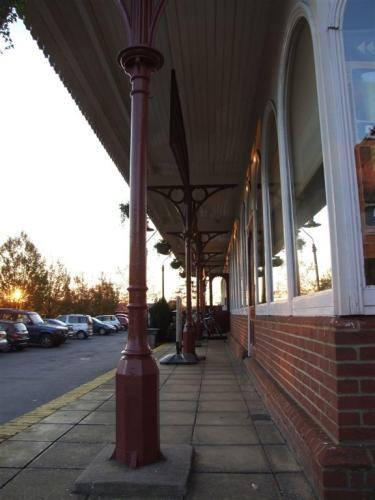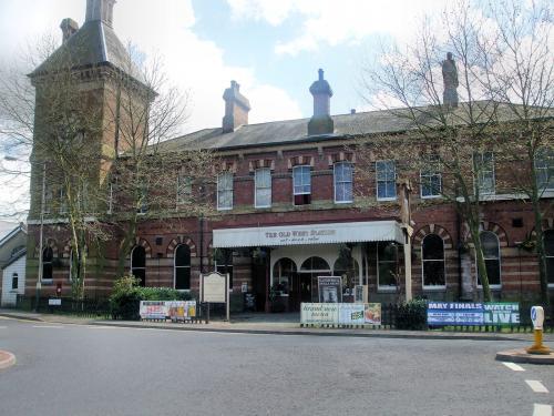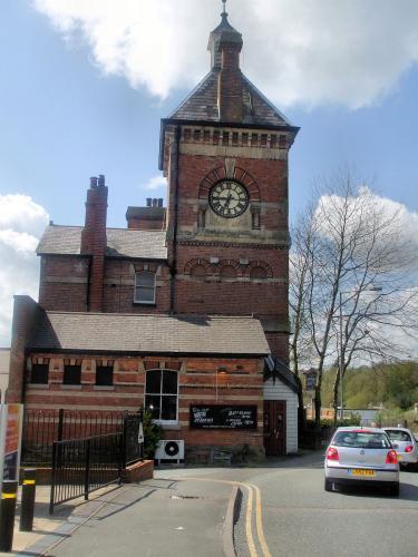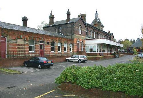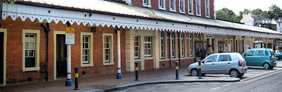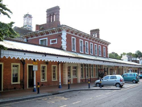 The imposing two-storey main station building was designed by C.H. Driver. The station is composed of a central block flanked on the western side by a gable-fronted wing, and on the eastern side by a three-storey clocktower with a pyramidal slate roof surrounded by a louvred cupola with a weathervane. The facade of the building is constructed of red brick with ashlar and black brick dressings; on the ground floor level are a series of nine round-arched windows and an arched doorway, with a decorated ashlar impost band connecting the windows. The eaves are serrated with an ashlar cornice. Inside the building was a gas-lit booking hall with four ticket windows and a panelled ceiling supported by arches springing from stone columns.