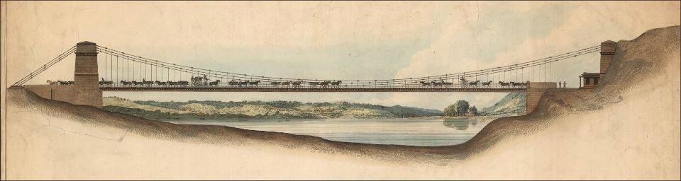 When erected in 1820 to the design of Cdr. Samuel Brown RN, a pioneer in chain making, this was the longest wrought iron suspension bridge in the world.