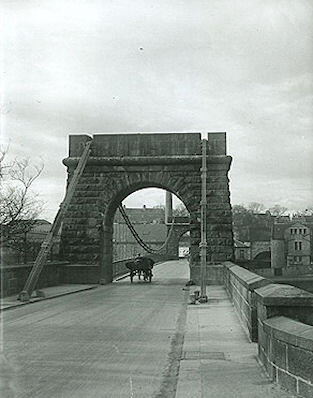 This narrow bridge was designed by Captain Samuel Brown and opened in 1831 to replace the Craiglug ferry. Refurbished in 1930, the bridge was closed to vehicular traffic in 1984 and to pedestrians in March 2002, because of corrosion in the wrought-iron chains and deterioration in the deck timbers. Following extensive renovation to strengthen and preserve the bridge, it was re-opened as a public footbridge in 2009.