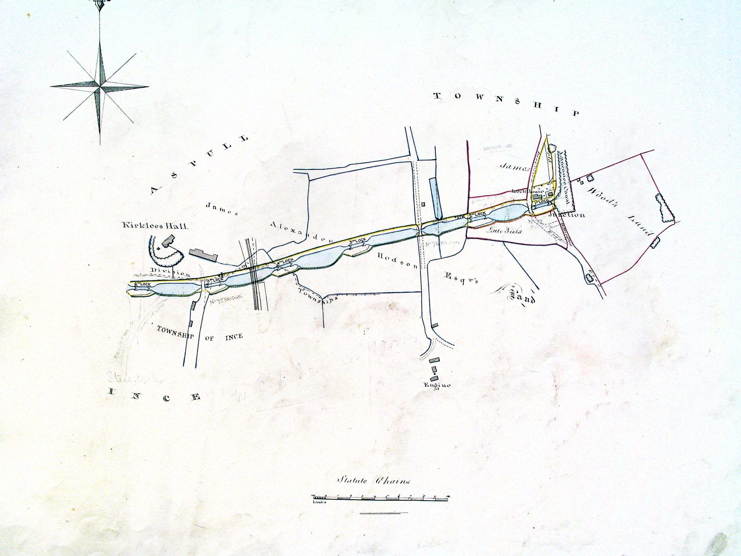 “From the statement of the East end of the line [i.e. regarding works at Wheelton] I will pass over the Lancaster Canal to the top part of the west end of the line near Kirklees from where locks have been regularly numbered down towards Wigan, the following of which numbers may be considered in a finished state, all but some little coping, viz Numbers 1, 2, 3, 6, 7, 8, 9, 10, 11, 14, 19, 21, 22 and 23 finished. The digging to which is part finished and the remainder following up as fast as possible.