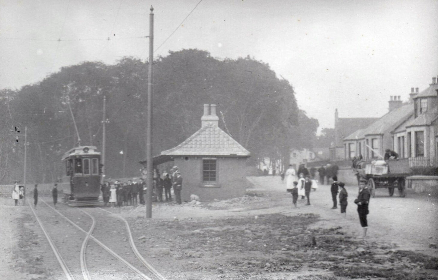 A cottage-style structure with a pantiled roof and canopy was provided to shelter Kirkcaldy-bound passengers in the pretty planned village of East Wemyss. Scottish Motor Traction acquired the tramway from Balfour Beatty and closed it down in January 1932, but the shelter has survived, and after a number of uses is now a hairdresser's.