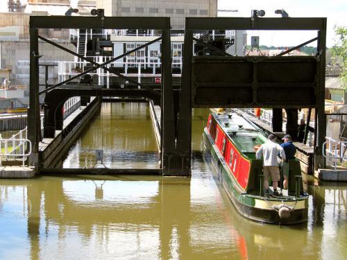 The Anderton Boat Lift near the village of Anderton, Cheshire, provides a 15 m (50 ft) vertical link between two navigable waterways - the River Weaver and the Trent and Mersey Canal. Built in 1875, the boat lift was in use for over 100 years until it was closed due to corrosion in 1983.