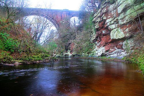 The stone bridge was begun in 1846 and was completed in less than two years (March 1848), but the railway itself was not completed until 1850. The stone was brought from Dundee.
