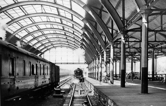 Parts of the distinctive glass roof were damaged during bombing raids in April 1942, and the glazing was not re-instated during railway usage after the war.