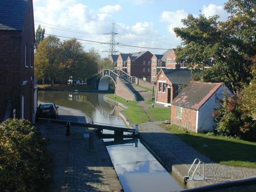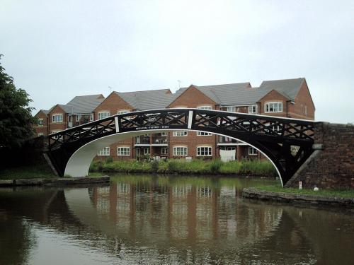 The most immediately striking feature in what is now a conservation area is the elegant bridge over the actual junction of the two canals. This cast iron structure is a fine example of the Victorian engineer's art, and has a span of 15.2 m (50 ft). The bridge was cast at the Britannia Foundry in Derby, and was erected for the Coventry Canal Company in 1837, at a cost of £630. The abutments are made of red hand-made bricks with a semicircular blue brick coping - this style of bridge, and combination of materials, was adopted between 1800-1840 on some of the Midlands canals; their use in this bridge shows a lightness of design unexpected with such heavy materials.