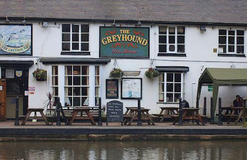 The Greyhound Inn and 18, Sutton Stop form a two storey terrace with smooth rendered walls and "rusticated quoins". Both are listed Grade II Listed Buildings. The windows are mostly simple casements though the Inn has two bay windows on the ground floor. The main doorway has now been restored to its original position as part of the recent major renovation of the building. Inside the pub some of the old features have been retained, such as a fireplace and some high back wooden settles, and at the rear, old farm buildings are reminders that early publicans of the inn were also farmers.
