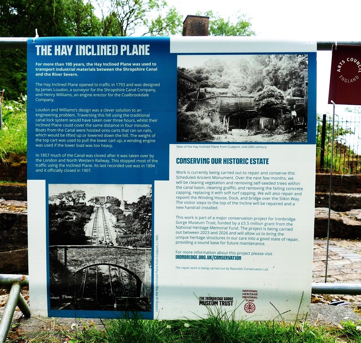 The Hay Inclined Plane was completed in 1793 and is one of the country's major industrial monuments and the best preserved and most spectacular of its kind. It was located on a short stretch of the Shropshire Canal that linked the industrial area of Blists Hill with the River Severn. It was in operation from 1792 to 1894. It enabled canal barges and narrowboats to be transferred from the bottom of the Severn gorge to the top, up a 1 in 4 gradient on wheeled cradles, operated by a team of just four men.