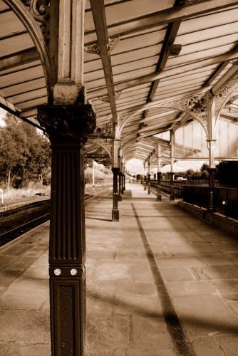The station of 1888 reflected this new role and its large single island platform with bays was served by a two storey stone station building and a large glass canopy supported by decorative iron columns.