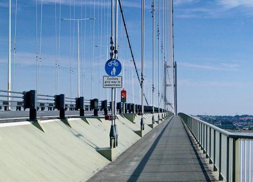 The bridge's surface takes the form of a dual carriageway with a lower-level foot and cyclepath on both sides, although traffic is often restricted to one lane both ways and there is a permanent 80 km/h (50 mph) speed limit. Each tower consists of a pair of hollow vertical concrete columns, each 155.5 m (510 ft) tall and tapering from 6 m (20 ft) square at the base to 4.5 — 4.75 m (14.8 — 15.6 ft) at the top. The bridge is designed to tolerate constant motion and bends more than 3 m (10 ft) in winds of 80 mph (129 km/h). Its slim graceful deck is an aerodynamically designed steel box girder; in a departure from previous practice, the connecting cables by which the deck is hung from the main cables are arranged in an inclined or zig-zag pattern rather than the normal vertical configuration.