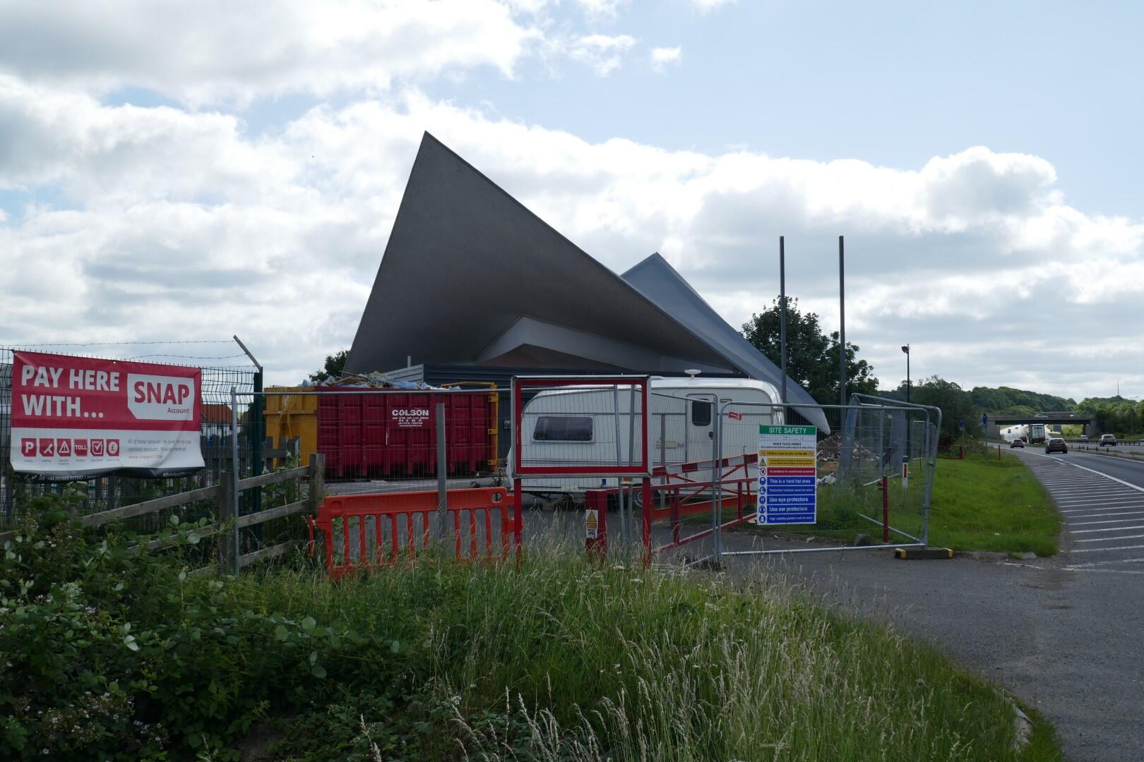 History: The canopy, once part of a former petrol filling station, was built in 1960-1 by Hugh Segar (Sam) Scorer, of Denis Clarke Hall, Scorer and Bright, for Messrs. A. H. Turner Ltd. The total cost was £4,500. The canopy takes the form of a hyperbolic paraboloid shell roof, also known as a saddle roof because of its distinctive shape. An article in Concrete and Constructional Engineering (February 1962) shows the simplicity of the original structure. Thin shell concrete roofs were invented in Germany around the 1920s, as a means of achieving large spans with limited materials and at low cost. The strength of the roof lies in its shape, and the way it carries the loads by the forces exerted in the planes of the shell, rather than by the weight of their materials. The first shell roofs were simple barrel vaults. One of the first engineers to specialise in concrete shell techniques in Britain was the German refugee Dr K Hajnal-Kónyi, who arrived in London in 1936, and who went on to work extensively with Sam Scorer. Scorer became fascinated by the possibilities of shell roofs as a student, and designed a hyperboloic paraboloid roof as early as 1956 on a water tower in Ilkeston, Derbyshire. The distinctive appearance of the canopy at Markham Moor gave it landmark status during the 1960s and 70s. In the late 1980s it ceased to be used as a garage, and a roadside Happy Eater, subsequently Little Chef restaurant was built beneath the canopy and was later empty for some years. Now a Starbucks coffee shop.