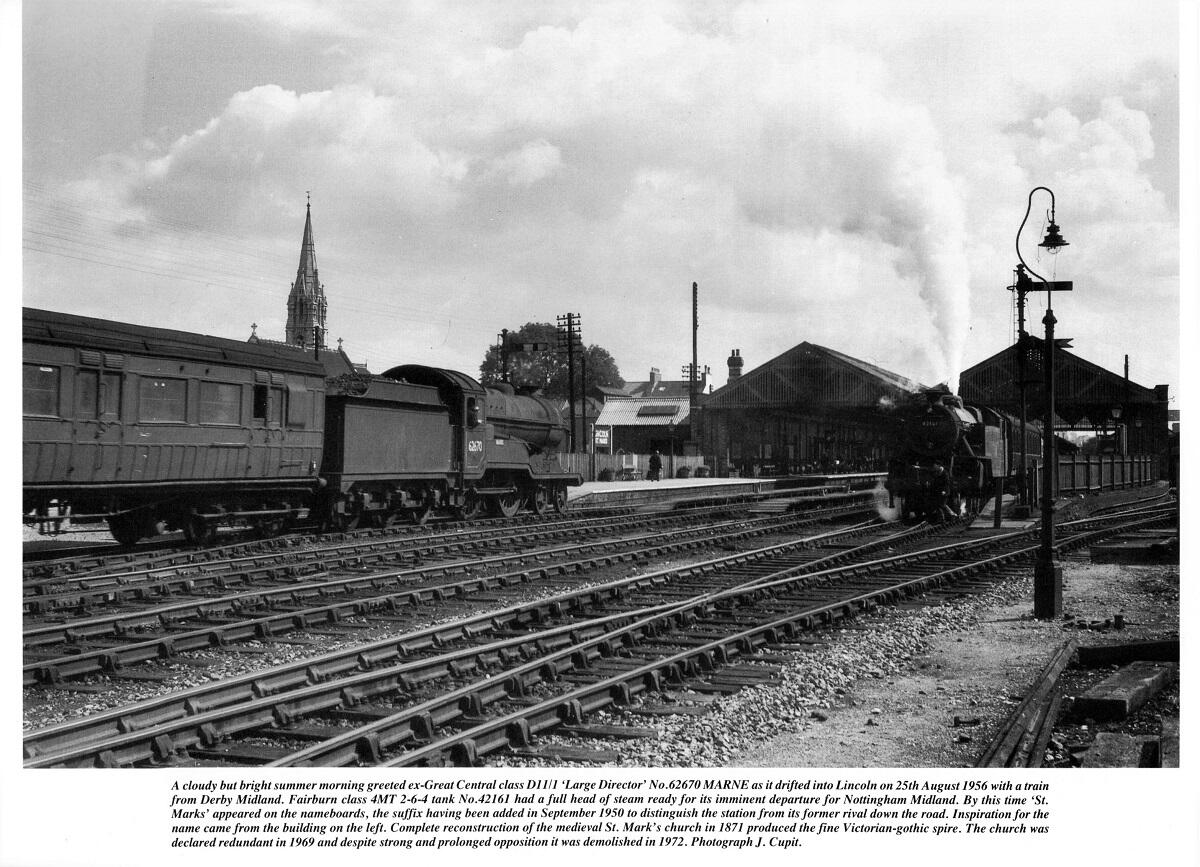 So, the Nottingham - Lincoln branch assumed the role of a purely local link, remote from the company’s thrusts towards St. Pancras. Manchester or Scotland. and this minor role continued for well over a century. In September 1950 the suffix 'St. Marks’ appeared on the nameboards to distinguish the station from its former rival down the road.