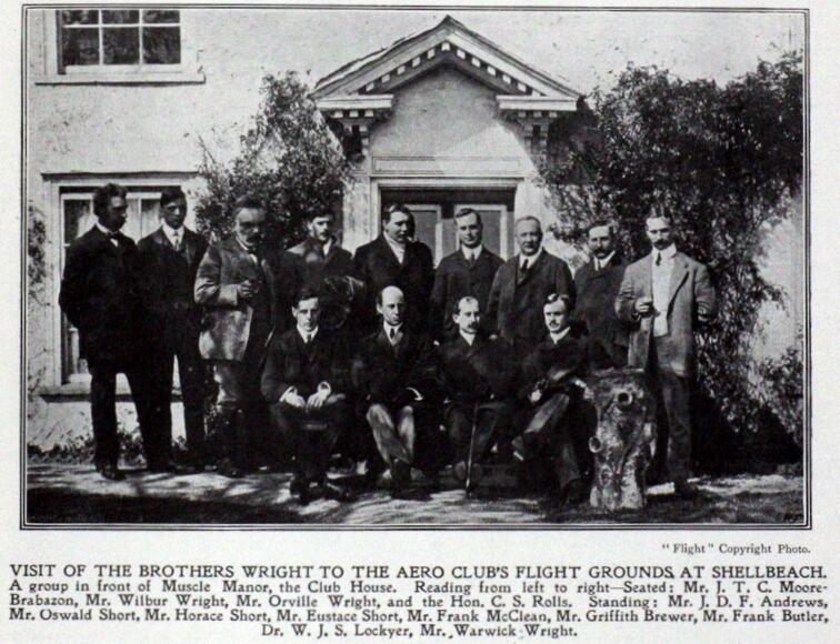 Frank Mcclean, yet another member of the Aero Club, Duly purchased a farmhouse, which lay half a mile away to be used as a clubhouse. Named ‘Muswell Manor’ he also purchased the surrounding several hundred acres of land known as Shellbeach from which to fly the aircraft being built by Short Brothers. Wilbur and Orville Wright visited Shellbeach on May 4 1909 and were pleased with the standard of workmanship being put into building the Flyers.