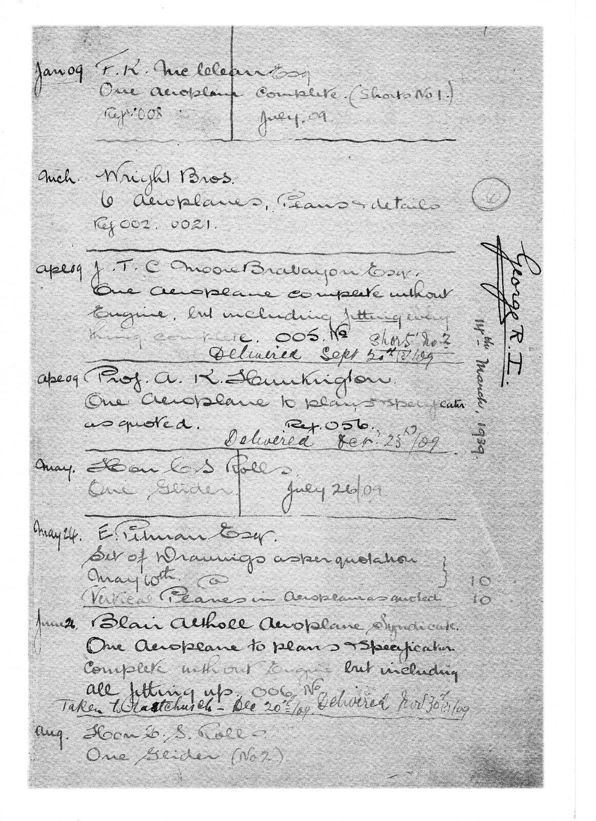 By August 1909, the Company were employing 80 craftsmen and were building aircraft for such aviators as the aforementioned Charles Rolls, the co-founder of Rolls-Royce, and also J T C Moore-Brabazon, later to become Lt Col J T C Moore-Brabazon MC, specialist in aerial photography during the 1914/18 War.