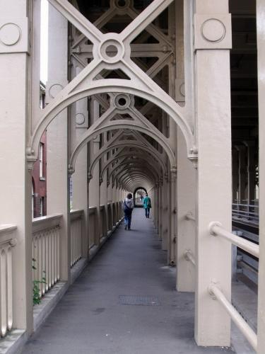 It is the first major example of a wrought iron tied arch or bow-string girder bridge. It is a fine and long standing engineering solution to a difficult problem; the spanning of 407 m.(1,337 ft.) of river valley, including 156 m.(512 ft.) across water. The High Level Bridge has six river spans of 38 m.(125 ft.)length, sitting on masonry piers, up to 40 m.(131 ft.)in height. There are also four land spans on each side. The single carriageway road and pedestrian walkways occupy the lower deck of the spans, 26 m.(85 ft.) above the high water mark, while the railway is on the upper deck, 34 m.(112 ft.) above the high water mark.